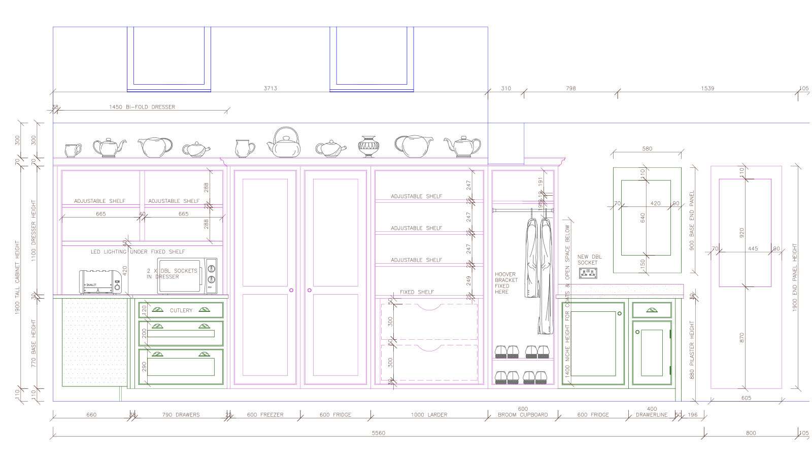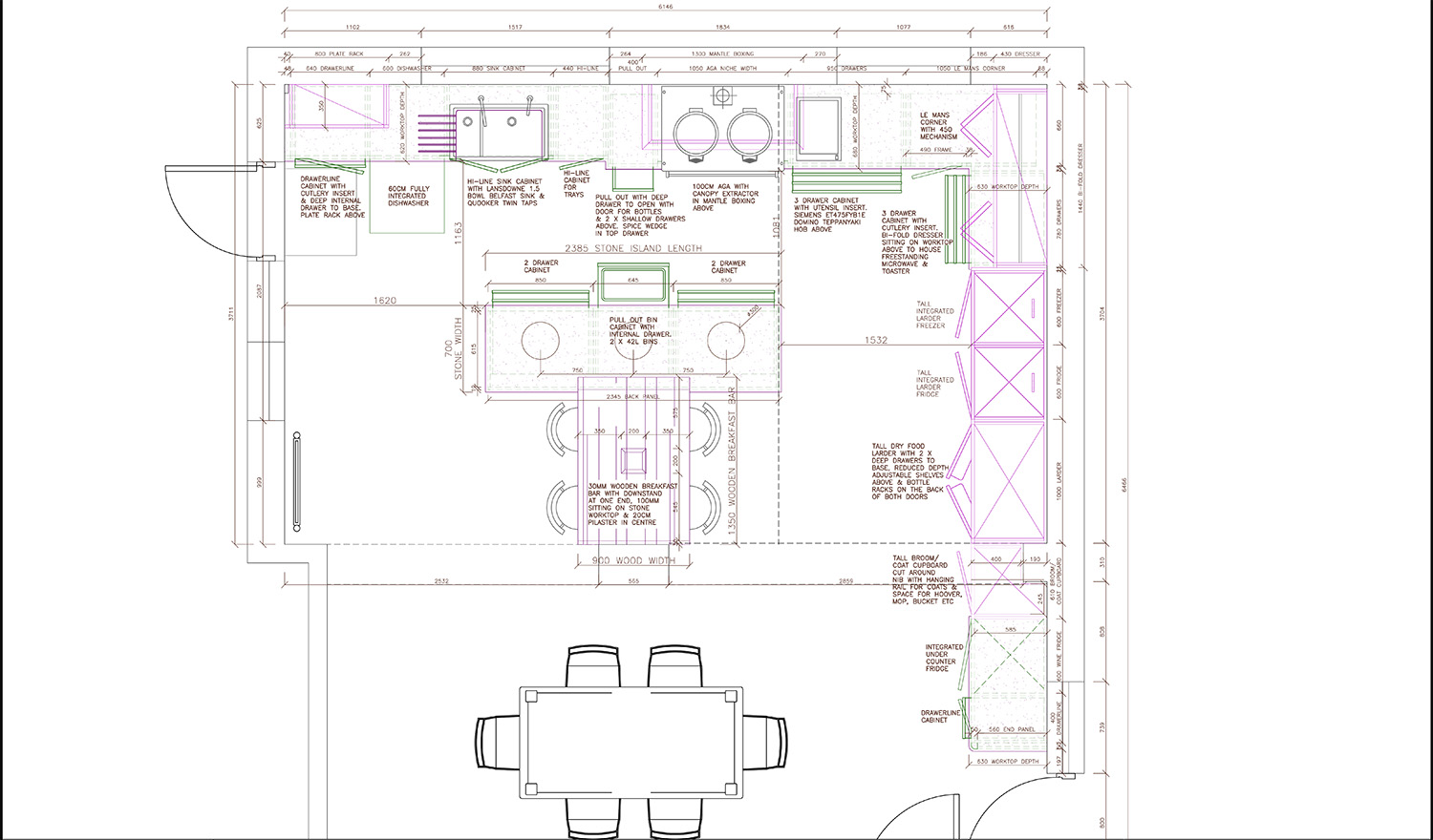 There were many interesting requirements for this kitchen renovation. A functional island with social seating to work around a central vertical steel, dining area, larder and dresser, broom cupboard which could also house outdoor shoes and somewhere to display the owner’s collection of china teapots! Cabinetry made by Charter Walk Kitchens.